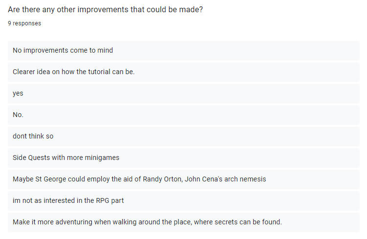 I took away some important things to consider from the responses of this final question.I will increase the number of mini-games and make the world the characters walk around in more interesting to explore, as well as including elements to show the player how to play the game.