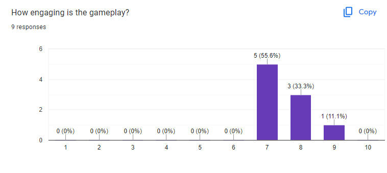 This question was similar to question 2, but more focussed on the mechanics of the game that I'd described.Just under half of the responses were either 8/10 or 9/10, with the remainder being 7/10, which I am happy with for now, as I will likely gather more feedback on my game mechanics as the creation of my game progresses.