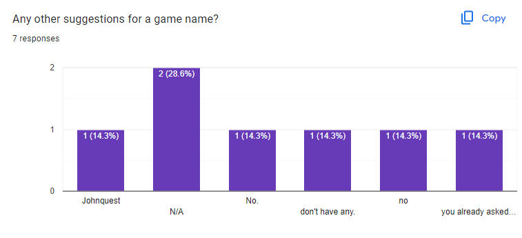 I included this question because I wasn't confident in my choice of game title and wanted to find out others' opinions on it.After reviewing this survey, I think I would have been better off asking how effective the title "St Dragon" is on a numerical scale, with an optional follow up box for suggestions, because over half of the answers didn't know what to suggest or simply agreed with my original response.