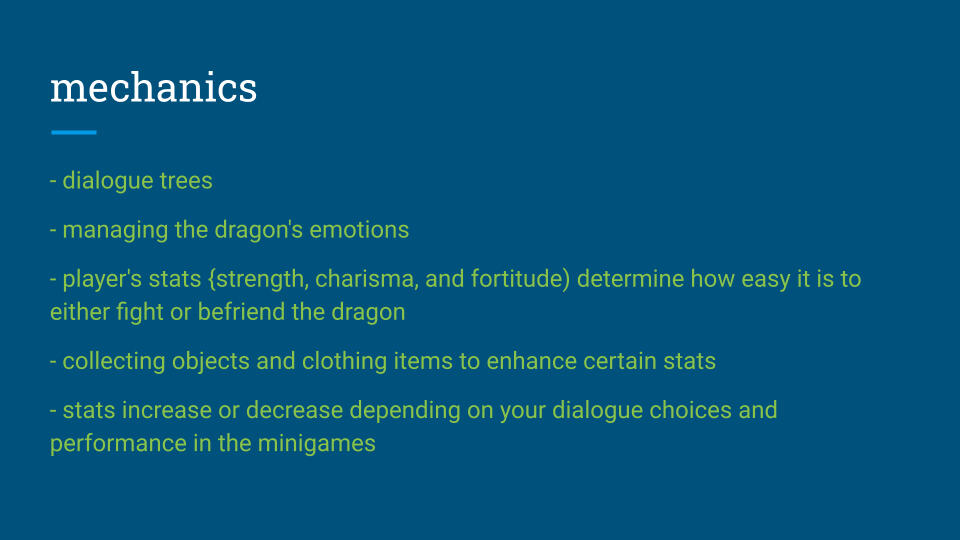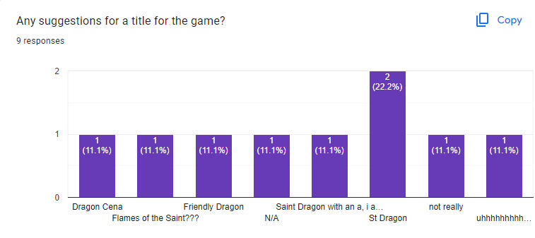 I included this question because I wasn't confident in my choice of game title and wanted to find out others' opinions on it.After reviewing this survey, I think I would have been better off asking how effective the title "St Dragon" is on a numerical scale, with an optional follow up box for suggestions, because over half of the answers didn't know what to suggest or simply agreed with my original response.