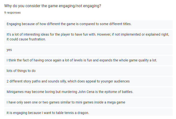 I took away some important things to consider from the responses of this final question.I will increase the number of mini-games and make the world the characters walk around in more interesting to explore, as well as including elements to show the player how to play the game.