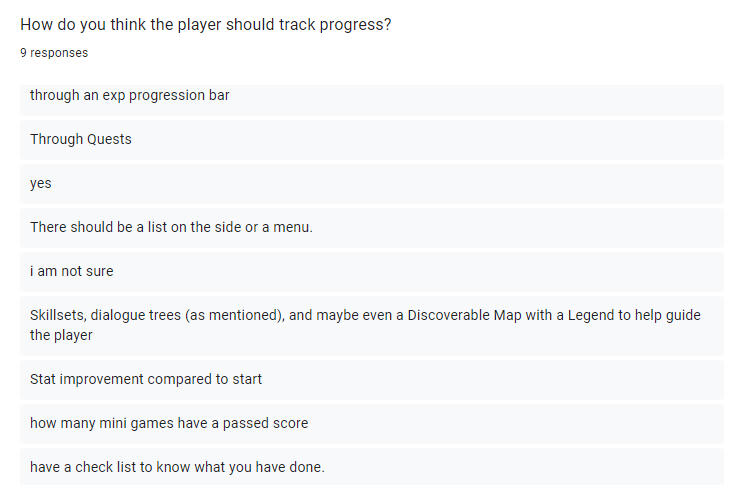 I included this question because I wasn't yet sure how tracking progress was going to happen.These responses helped me to solidify what I wanted to include: using both stat improvement and a checklist/quests