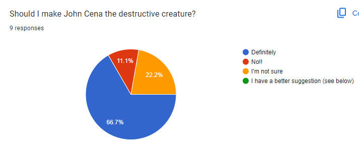 I included this question because I wasn't entirely sure if the idea of including John Cena in my game was a little too goofy or out of nowhere, but the majority of respondents seemed to think it was a good idea!