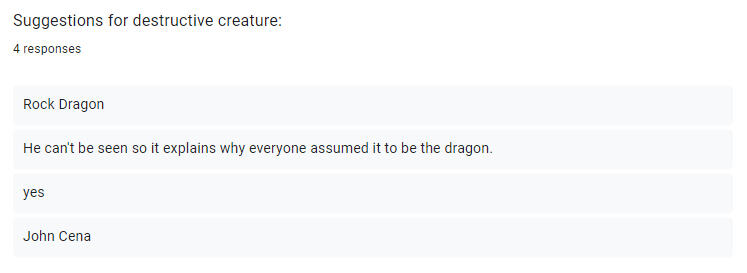 This question was optional, so there weren't many responses (also because most people liked the idea of John Cena), and only one of the answers for this section was actually usable.Because of the majority of respondents liking the more goofy idea of including pro wrestler John Cena, I will be going with that.