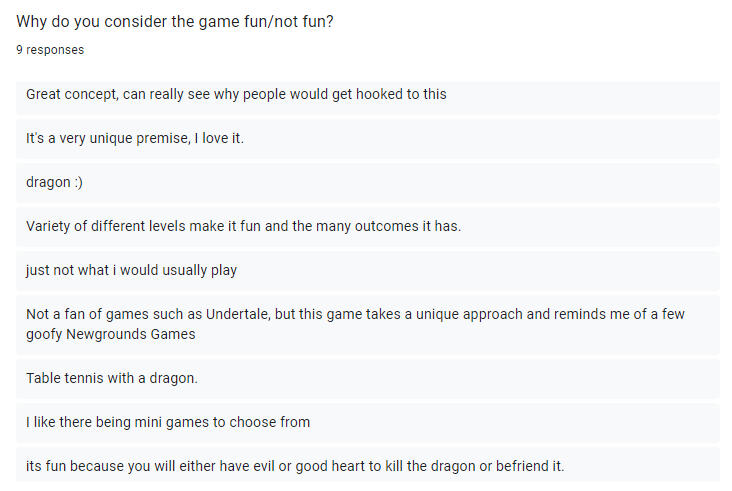 This is an extension of question 4, to expand on their answers.Again these answers I find useful in knowing what will hook people into my game, but also the responses about the minigames becoming boring/frustrating is valuable feedback and I will keep it in mind when developing my game further.